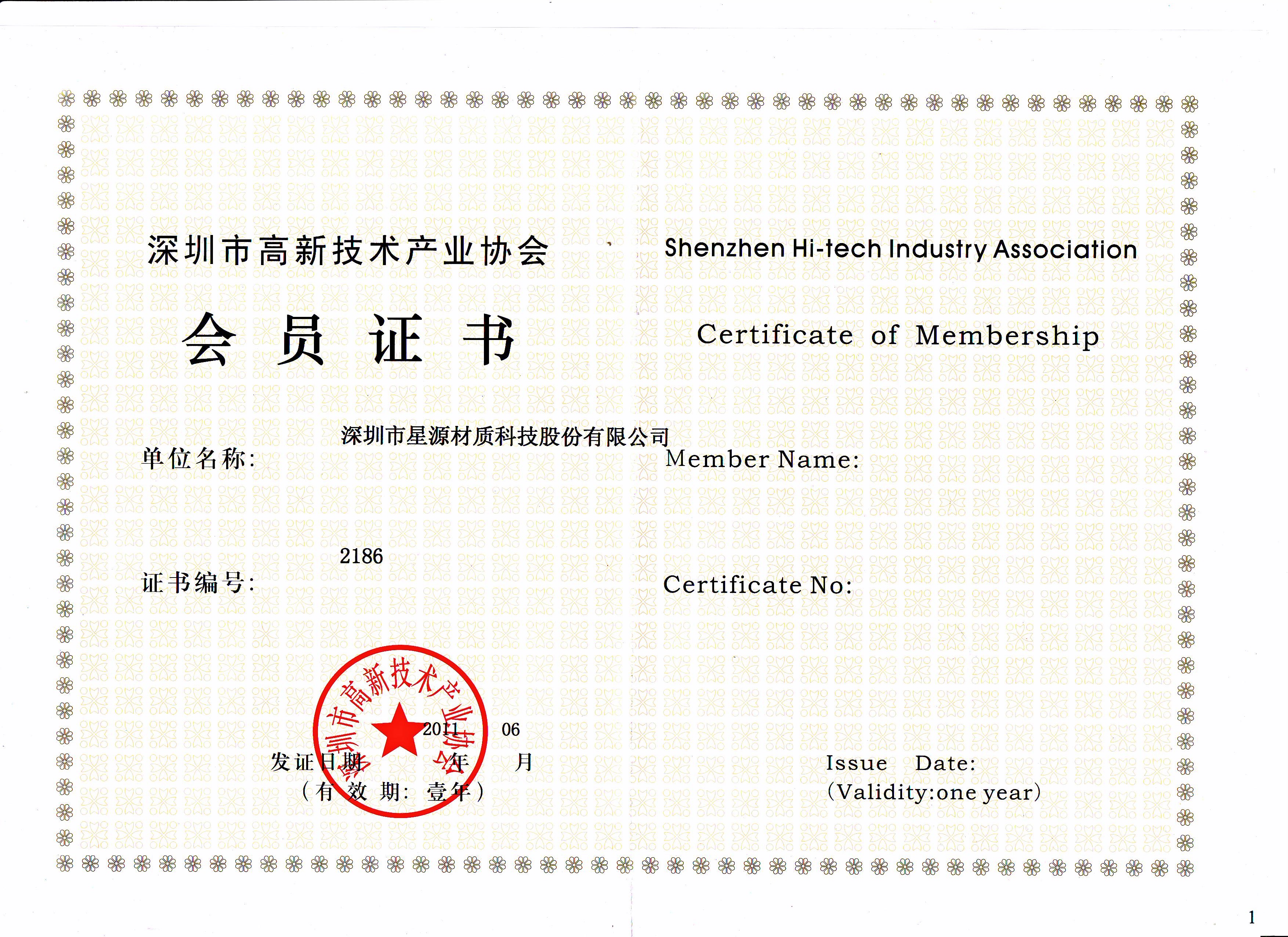深圳市高新手艺工业协会会员证书